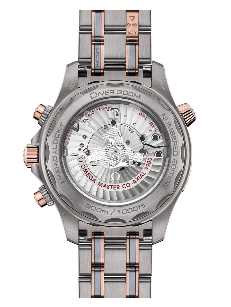 為了抵消重量,歐米茄在新的 44 毫米編號版本的構造中少量使用了鉭。具體來說,它被用于表圈的刻面底座和手鏈的鏈節,這是最容易損壞的元件。表殼主體采用 2 級鈦金屬,重量輕,按鈕、排氦氣閥和表圈嵌件以及表鏈鏈節邊緣均采用歐米茄專有的耐腐蝕 Sedna? 金。