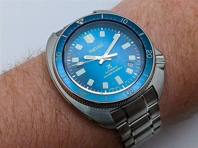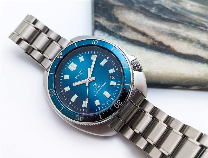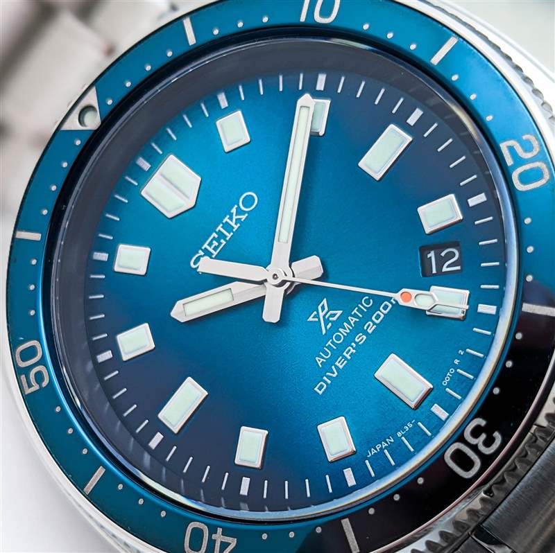 Seiko 因其在其整個型號系列中打造極具吸引力的表盤而享有盛譽(yù),但即使按照該品牌自己的標(biāo)準(zhǔn),Prospex SLA063 的表盤也是真正的佼佼者。SLA063 的調(diào)色板旨在喚起北極光的發(fā)光、空靈的色彩,立即將自己從 Prospex 系列的其他產(chǎn)品中脫穎而出,這種動態(tài)外觀是多級精加工工藝的結(jié)果。首先,該品牌在這里使用了一種非正統(tǒng)的漸變效果,表盤的邊緣在 3 點(diǎn)鐘和 9 點(diǎn)鐘位置漸變?yōu)樯钗缫顾{(lán)色,與從 12 點(diǎn)鐘方向延伸至 6 點(diǎn)鐘方向的較亮條紋形成鮮明對比。接下來是經(jīng)典的旭日形效果,具有適度的顆粒感和寬廣的動態(tài)范圍。在此之上,精工在表盤表面添加了淡淡的波紋紋理,這有助于在視覺上柔化旭日紋理的邊緣,使其更像北極光的幽靈般纖細(xì)的外觀。當(dāng)然,最引人注目的元素是表盤顏色本身。這種豐富、細(xì)膩的藍(lán)色色調(diào)在不斷變化的光線下顯示出多種多樣的陰影變化和底色,從近乎黑色到鈷藍(lán)色、綠松石色,甚至淡綠色。這是一種閃閃發(fā)光、復(fù)雜的色調(diào)組合,很難在相機(jī)上捕捉到,但在實踐中立即引人注目。這種對細(xì)微差別的承諾也延伸到 SLA063 的表盤文字和外部分鐘軌道,采用精致的金屬銀色印刷呈現(xiàn),為手腕上的表盤增添了額外的光彩。表盤布局本身的其余部分大多遵循熟悉的“Willard”圖案,忠實再現(xiàn)矩形應(yīng)用索引,6105 獨(dú)特的指揮棒聽筒和一眼就能認(rèn)出的“紅綠燈”秒針上的變化。精工將 SLA063 的日期窗口移至 4:30 位置的決定可能會引起爭議,但這種偏離中心的位置有助于在視覺上保留索引的布局,而黑色日期輪則讓這個元素在看時或多或少地消失撥號。
